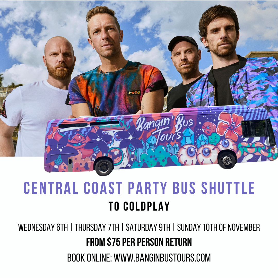 Head to Coldplay with ease by booking in our Central Coast Party Bus Shuttle. Transporting you from the Central Coast to Accor Stadium and return from $75 per person. Your favourite party bus on the Central Coast Bangin Bus Tours is officially doing shuttle bus services for most major upcoming events! 🥳