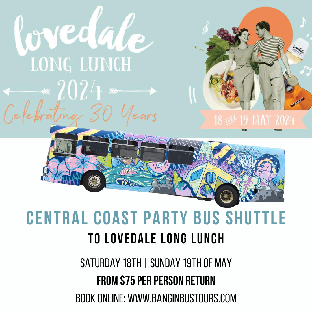 Head to Lovedale Long Lunch with ease by booking in our Central Coast Party Bus Shuttle. Transporting you from the Central Coast to Lovedale and return from $75 per person. Your favourite party bus on the Central Coast Bangin Bus Tours is officially doing shuttle bus services for most major upcoming events! 🥳