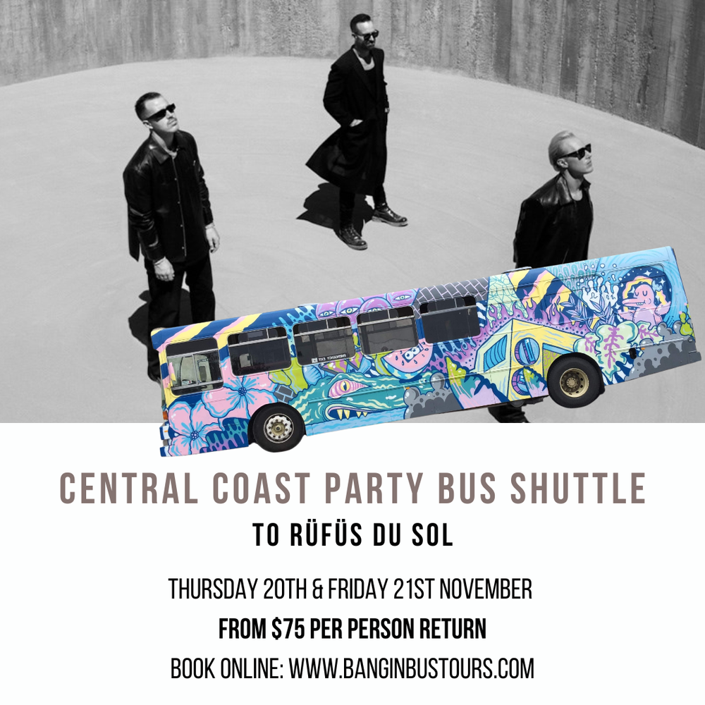 Head to RÜFÜS DU SOL with ease by booking in our Central Coast Party Bus Shuttle. Transporting you from the Central Coast to Qudos Bank Arena and return from $75 per person. Your favourite party bus on the Central Coast Bangin Bus Tours is officially doing shuttle bus services for most major upcoming events! 🥳