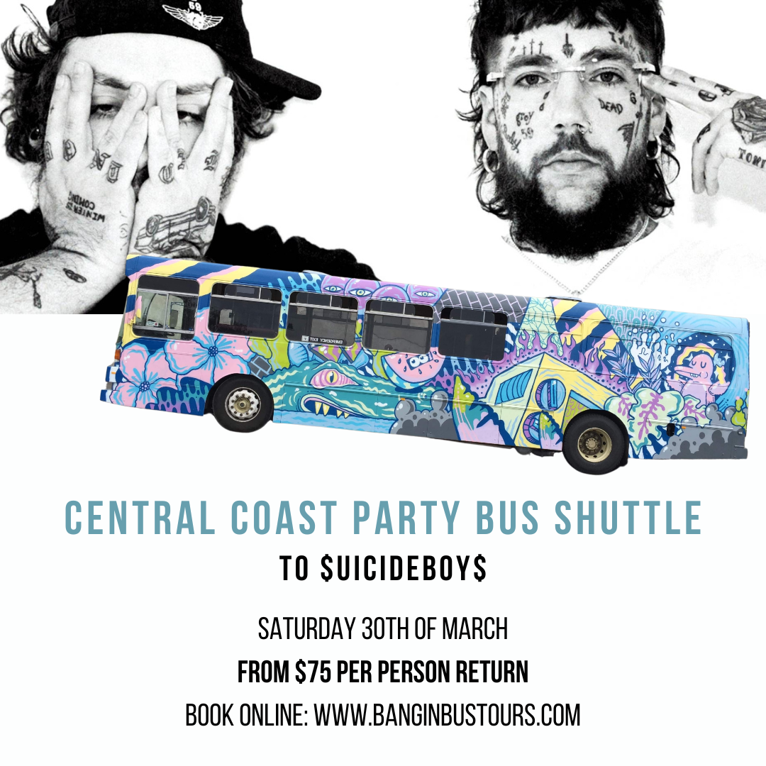 Head to $UICIDEBOY$ with ease by booking in our Central Coast Party Bus Shuttle. Transporting you from the Central Coast to Qudos Bank Arena and return from $75 per person. Your favourite party bus on the Central Coast Bangin Bus Tours is officially doing shuttle bus services for most major upcoming events! 🥳