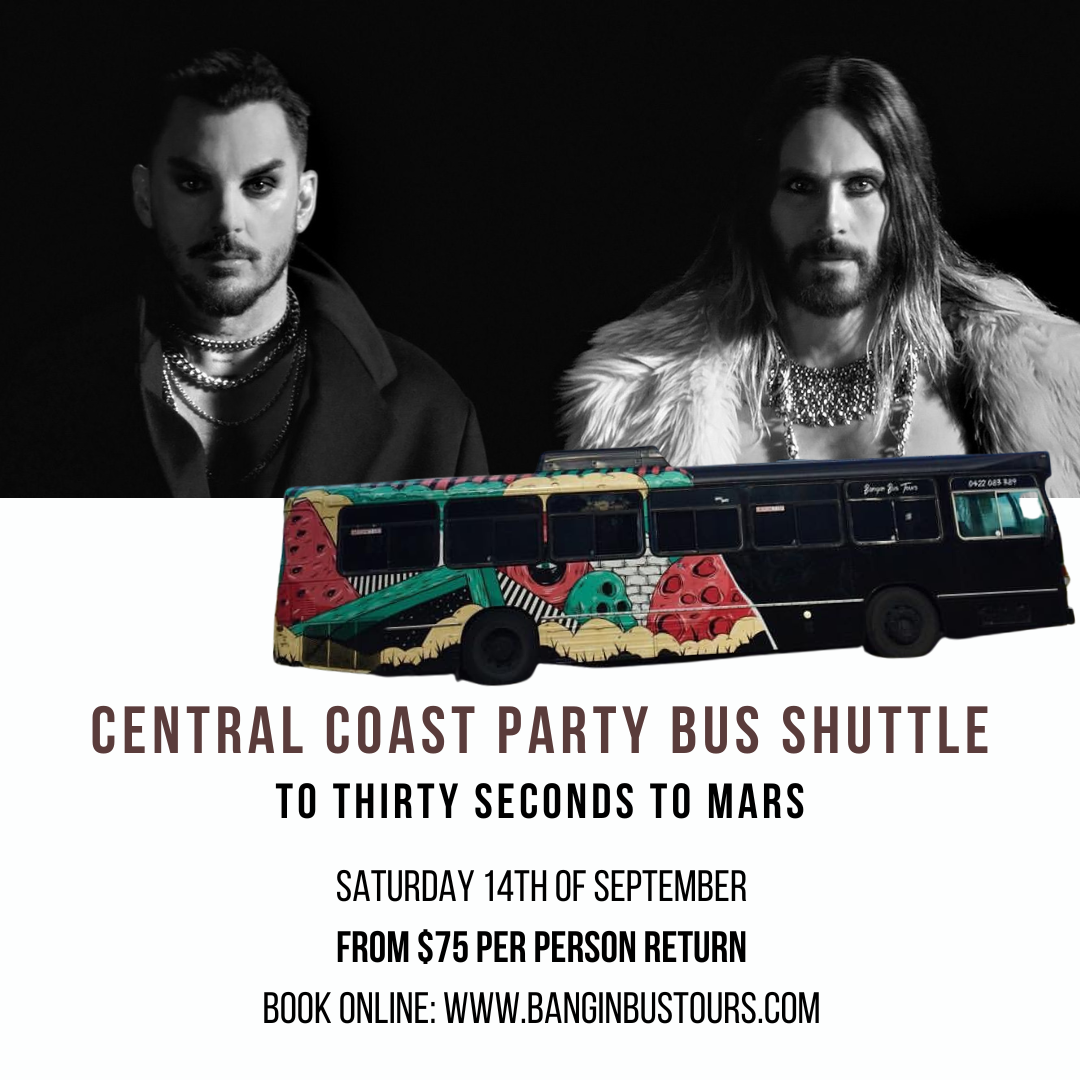 Head to Thirty Seconds to Mars with ease by booking in our Central Coast Party Bus Shuttle. Transporting you from the Central Coast to Qudos Bank Arena and return from $75 per person. Your favourite party bus on the Central Coast Bangin Bus Tours is officially doing shuttle bus services for most major upcoming events! 🥳